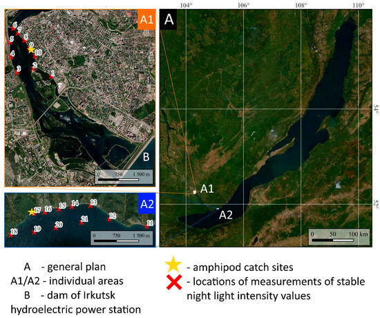 Among all the migratory amphipods of Lake Baikal, one species can be distinguished. This is Gmelinoides fasciatus (Stebbing, 1899). This species is widespread in the littoral zone of Lake Baikal, as well as in many rivers [35]. During the Soviet period, this species was introduced into lakes in the European part of Russia to increase the food supply for fish. At present, this species is considered invasive and actively displaces native species in many water bodies in the European part of Russia [36,37]. G. fasciatus makes a significant contribution to the structure and functioning of the benthic community, which is ensured by omnivorousness, adaptation to various substrates, and the ability to withstand moderate pollution [38]. The life cycle of this species is quite flexible, and in addition, it is significantly influenced by environmental conditions (in particular, temperature) [39]. At the same time, in Lake Baikal, the species is considered one of the main participants in daily vertical migrations and is actively attracted by artificial lighting. Currently, due to the construction of the Irkutsk hydroelectric power station (in the middle of the last century), a population of this species has formed within the city of Irkutsk. This population is partially isolated from Lake Baikal due to the dam. In addition, this population (located within the boundaries of a large city) is significantly affected by light pollution. Based on this, in this study, we decided to clarify some questions. (1) How much does light pollution (and what color temperature predominates) differ within the city of Irkutsk from what can be observed on Lake Baikal? (2) How did G. fasciatus individuals adapt to the effects of light pollution? (3) Will there be differences between individual and group behaviors?