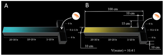 Scheme of the aquarium for experiments (with the place where the individuals were placed), with division into zones depending on the intensity of lighting: (A) cold lighting; (B) warm lighting.