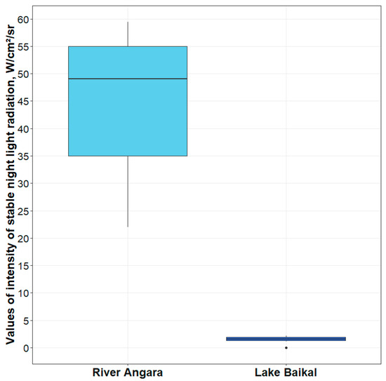 The data on the values of the intensity of stable night light radiation from the Earth’s surface were taken as monthly average values for July 2024 (the data are presented in units of measurement of W/cm2/sr). The Visible and Infrared Imaging Suite (VIIRS) Day Night Band (DNB) product, presented in two versions vcmcfg and vcmslcfg, was used as a data source. We chose the vcmslcfg version, which includes data adjusted for extraneous light. This version is of lower quality, but it is the only one that covers the research area. The data were obtained from the Earth Observation Group website (https://eogdata.mines.edu/products/vnl/) (accessed on 23 September 2024). The spatial resolution of the resulting raster layers is 400 m. The data for comparison were extracted using QGIS software at 21 points (for Bolshiye Koty Bay—11 points, for the Angara River section—10 points) (Figure 1) [40,41].