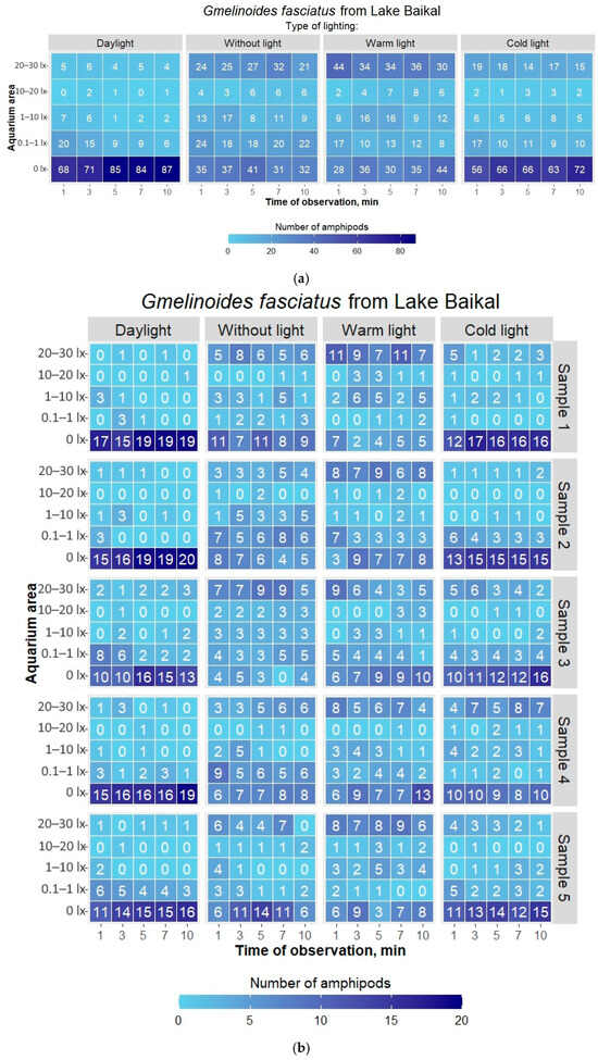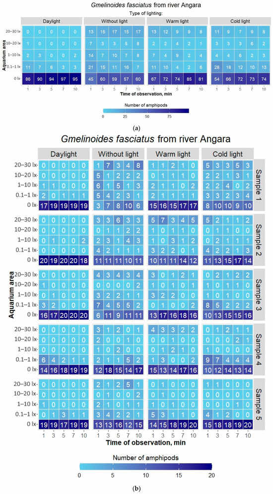 (a) Generalized results of a series of experiments involving G. fasciatus individuals from the Angara River. (b) Detailed results of a series of experiments involving G. fasciatus individuals from the Angara River.