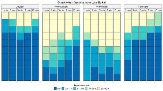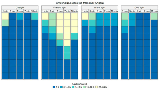 Analysis of the individual behavior of G. fasciatus from the Angara River shows (Figure 7, Table 7) that under any type of lighting (daytime sunlight or warm/cold artificial lighting), amphipods try to stay in the darkest place. The latter statement is supported by data on group behavior (Table 4).