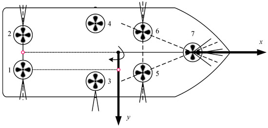 This paper conducts research based on “Hai Yang Shi You 201”. Seven rotary thrusters were installed on the vessel, as shown in Figure 3.