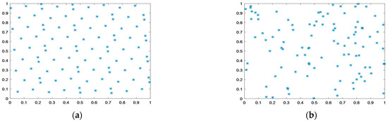 - In the original DBO algorithm, random population initialization is used to initialize the population, which inevitably brings uncertainty. Therefore, the GPSPI is introduced to eliminate the uncertainty caused by random population initialization. The GPSPI method is a uniformly distributed and effective technique for selecting points. By utilizing the uniformity of the GPSPI, the population diversity can be improved. At present, the GPSPI has been applied to many intelligent algorithms. The results of two population initialization methods are given as follows: