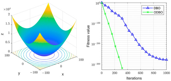 To verify the superiority of our proposed improvement strategy, we compared the improved algorithm (ODBO) based on Equation (11) with the original algorithm (DBO) by using the classical test functions [32]. According to Ref. [32], the parameters are set as , , , , . The comparison result is shown below: