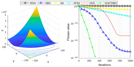 To verify the effectiveness of our proposed three improvement strategies, we compare the HOATDBO algorithm with several popular swarm intelligent optimization algorithms. The parameters of HOATDBO are set as , , , , , , and . The parameters of GA [27], AFSA [30], DBO [32], the Whale Optimization Algorithm (WOA) [39], and Harris Hawks Optimization (HHO) [40] can be seen in the corresponding references. The simulation result is as follows:
