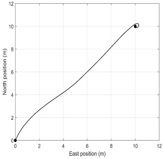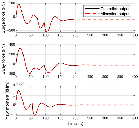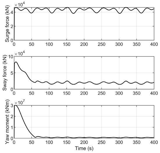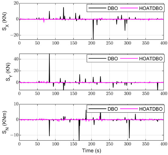 Figure 8 describes the change curve of the environmental disturbance forces and moment exerted on the vessel. From Figure 8, we can see that environmental disturbance slowly varies over time, which is consistent with the marine environments in the real world. Figure 9 describes that the vessel can move from the initial position to the desired position and ultimately stabilize there. Figure 10 shows the response curves for positions and headings. It is evident from Figure 10 that the vessel can stabilize at around 100 s. Figure 11 shows the velocities and yaw rate of the vessel. Figure 8, Figure 9, Figure 10 and Figure 11 demonstrate that the HOATDBO-based TA can achieve dynamic positioning with high precision under dynamic environmental disturbance. Figure 12 shows the comparison between the output commands of the controller and thrusters. We can conclude from Figure 12 that the composite output command of the thrusters can track the controller command well, validating the effectiveness of our proposed HOATDBO-based TA algorithm.