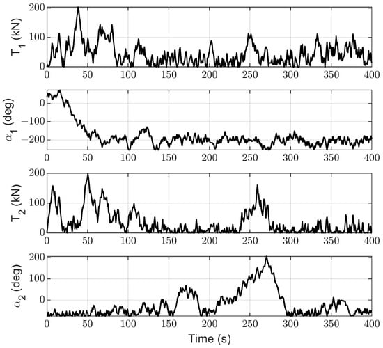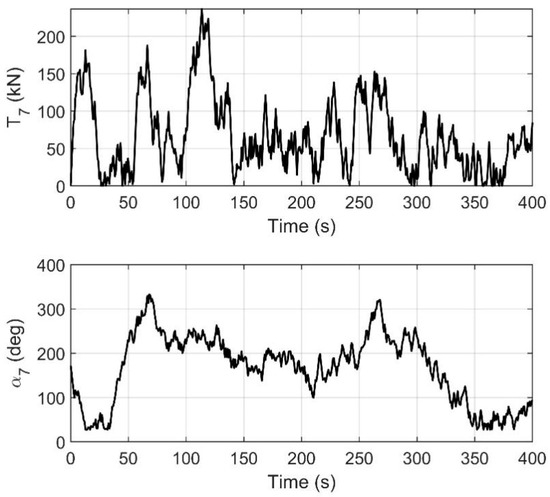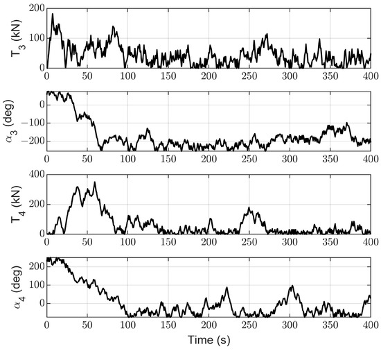 Figure 13, Figure 14, Figure 15 and Figure 16 represent the changes in the thrusts and azimuths of the seven thrusters. Figure 13, Figure 14, Figure 15 and Figure 16 demonstrate that the thrusts and azimuths of the thrusters, which are all within the allowable range. This is in line with the practical application requirements of thrusters.