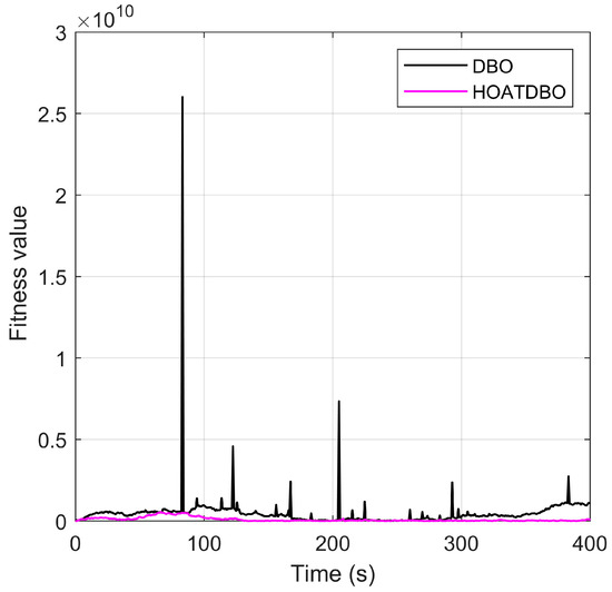 Figure 17 illustrates the force and moment allocation errors under the DBO and HOATDBO methods. It can be seen that the allocation errors under HOATDBO are much smaller than those under DBO. The allocation errors under HOATDBO have fewer mutation points and smaller overshoots than those under DBO. Figure 18 shows the fitness values of the DBO and HOATDBO methods. From Figure 18, we can see that the fitness value of HOATDBO tends towards stability earlier than that of DBO. It is demonstrated that HOATDBO has significantly faster convergence compared to DBO. Further, it implies that the HOATDBO method increases the probability of avoiding local optimums and obtaining optimal results.