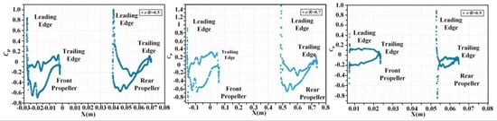 Figure 7, it can be observed that the front propeller exhibits a significant pressure difference at the leading edge, generating substantial thrust, while the rear propeller demonstrates high pressure values at the leading edge but with minimal pressure differential variation.