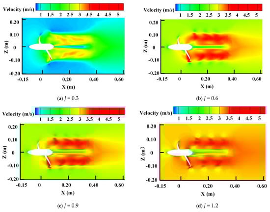 Figure 10 delineates the velocity distribution of the toroidal propeller across varying advance coefficients