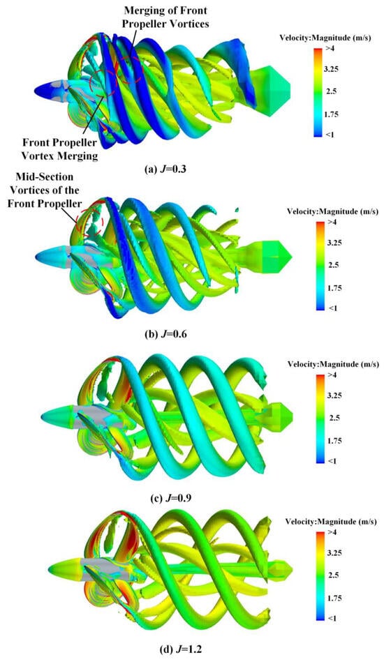 The vortical structures exhibit distinct characteristics as the advance coefficient J varies. Under higher advance coefficients, the tip vortices of the front propeller and the vortices generated by the rear propeller maintain a helical distribution without merging. As J increases, the mid-section vortices of the front propeller gradually weaken. The velocity characteristics of the vortical structures demonstrate significant differences across advance coefficients. At low J, the internal vortices within the front propeller exhibit substantially higher velocities compared to the external tip vortices. However, as J increases, the velocity of the tip vortices rises accordingly, thereby reducing the velocity disparity between internal and external regions.