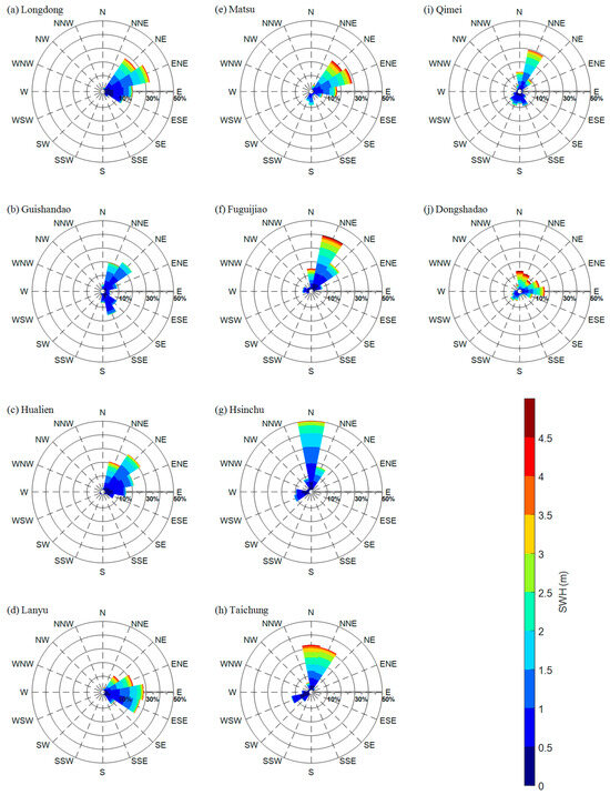 Wind rose chart measured at the ten weather buoys. (a–d) are located in the waters east of Taiwan, and (e–j) are located in the waters west of Taiwan.