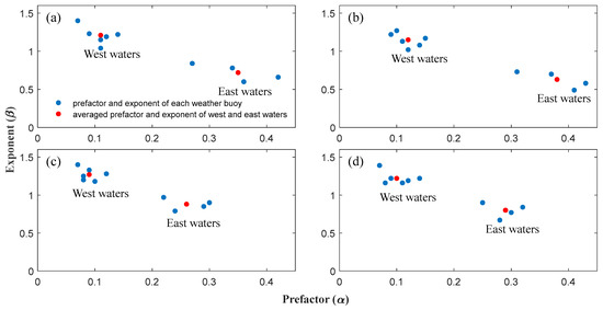 Distribution of α and β of the wind-to-wave relationship at the ten weather buoys. Two red dots represent the average of the prefactor and scaling exponent of weather buoys in the waters east (lower right) and west (upper left) of Taiwan, respectively, derived using (a) all data, (b) data with wave period less than 10 s, (c) data with direction difference less than 45°, and (d) data with wave period less than 10 s and direction difference less than 45°.