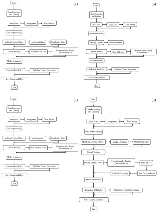 Training flow chart of the four machine learning algorithms. (a) DT, (b) XGBT, (c) RF, and (d) LSTM.