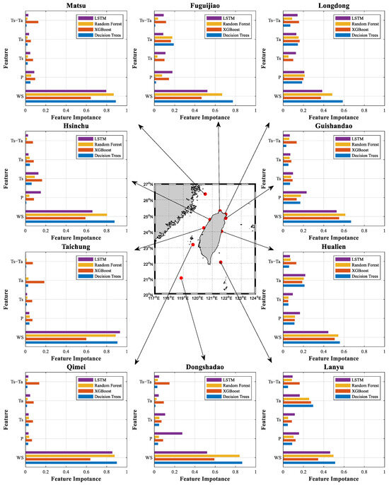 To elucidate the regional disparities in wind–wave relationships, feature importance analyses were conducted for the four machine learning algorithms (DT, XGBT, RF, LSTM). Figure 7 presents the weights of feature variables across all buoys. While wind speed emerges as the dominant feature in all models and locations, its relative importance varies spatially. For the two highest-performing algorithms (XGBT and RF), wind speed weights in western waters (0.59–0.64 for XGBT, except the Fuguijiao weather buoy at 0.47; >0.81 for RF, except the Fuguijiao weather buoy at 0.67) exceed those in eastern waters (0.34–0.50 for XGBT; <0.61 for RF). This suggests that wind speed is the primary driver of wave growth in the waters west of Taiwan, with minimal influence from secondary factors. Conversely, eastern waters exhibit lower wind speed weights, with air pressure and air temperature contributing approximately 1/3 to 1/2 of the wind speed’s influence. The disparity in wind speed weights aligns with regional wind speed differences (Table 2), where western waters exhibit stronger winds. This may explain the superior regression performance in western Taiwan, as higher wind speeds enhance wind–wave coupling.