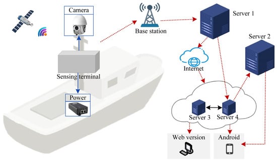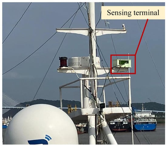 The sensing terminal subsystem is installed in a research vessel, as shown in Figure 8. The fishing vessel has a total length of 44 m and a width of 8 m, with a maximum speed of 12 knots and a displacement of 700 t. Monitoring cameras are installed mid-mast, facing the vessel’s forward direction to provide comprehensive coverage. The power supply equipment is located inside the wheelhouse. The sensing terminal subsystem is positioned 12 m above the sea surface and is mounted on a mast bracket arm. The surveillance camera is fixed to the platform located on the lower side of the mast.