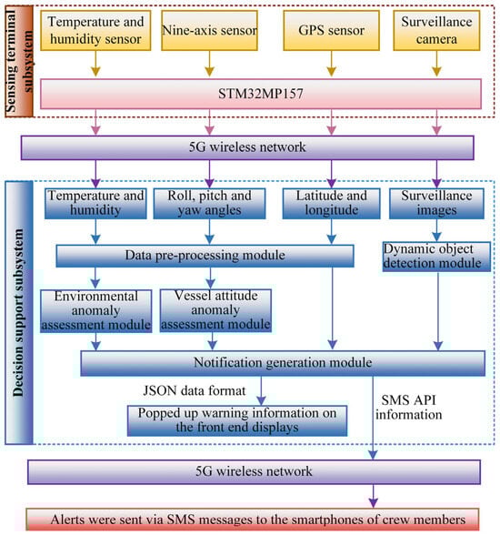 The decision support subsystem (DSS) is mainly composed of a data preprocessing module, dynamic object detection module, environmental anomaly assessment module, vessel attitude anomaly assessment module, and notification generation module. The DSS acquires environment data, vessel attitude, GPS coordinates, and surveillance images in real time. Then, the raw data from sensors are preprocessed through the data preprocessing module. The environmental anomaly assessment module analyzes the real-time data from the temperature and humidity sensors and then determines whether the environmental information is abnormal. It sends alert messages to the notification generation module if temperature and humidity exceed the threshold value. The vessel attitude anomaly assessment module analyzes the real-time data from the vessel’s sensors and predicted the attitude status of the vessel. The notification generation module displays the warning information on the web end or sends SMS alerts to the registered users if necessary. Detailed information on each control module can be found below.