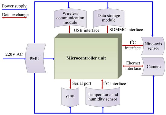 - Power management unit (PMU): The PMU (Texas Instruments, Austin, TX, USA) is used to provide appropriate DC voltages for terminal components, for example, from 220VAC to 12VDC, 12VDC to 5VDC, and 5VDC to 3.3VDC.