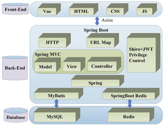 - Back-end: Consists of code that communicates between the client browser and the database. In detail, this includes updating, managing, and monitoring application functionalities and data. In this study, Spring Boot, Spring MVC, and MyBatis were combined to implement the back-end platform, aiming to support a variety of widely used authentication methods, large relational and non-relational databases, a map-reduce framework, and cloud data services [].