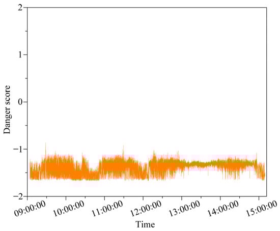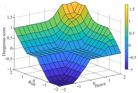 Figure 13 shows the prediction “danger score” based on data from Figure 10, Figure 11 and Figure 12 using the fuzzy logic control method. It can be found that, normally, large rolling motions occur together with large pitch motions. Furthermore, it can be concluded that during the experiment, the “danger score” is less than −1 at all times, indicating that the vessel is under a safe navigation condition. However, the decision support subsystem will send text messages to the vessel crew’s smartphones and pop up the security alert on the web platform if the “danger score” is above 1.