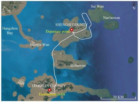 Figure 9 illustrates the navigation routes of the research vessel on 11 May 2024, between 09:00 and 15:00. The vessel’s speed seems to have been 13 knots, and the total distance traveled by the vessel is approximately 142 km.