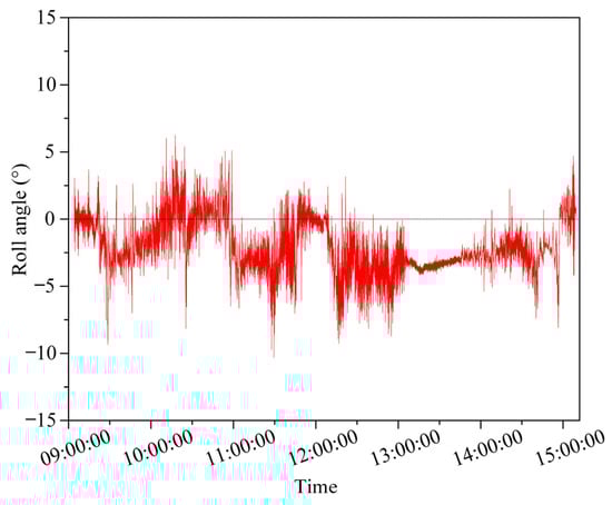 Figure 10 shows the vessel’s roll angle of the research vessel between 09:00 and 15:00. The length of each time interval is 1 s. It can be clearly seen that the highest roll motion is 6.25°, the minimum roll motion is −10.31°, and the roll’s average value is less than zero, indicating that the starboard side seems higher than the port side of the vessel.