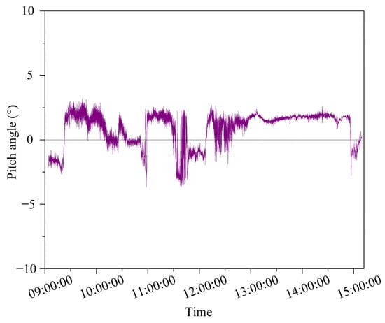 Figure 11 gives the vessel’s pitch angle of the research vessel between 09:00 to 15:00. It can be found that the maximum pitch motion is 3.19° and the minimum pitch motion is −3.68°. The pitch’s average value is higher than zero, which means that the bow is more likely to sink than to rise.