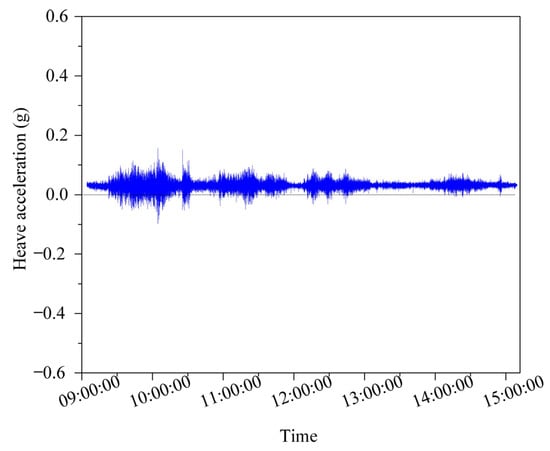 Figure 12 shows the vessel’s heave acceleration of the research vessel between 09:00 and 15:00. It can be concluded that the maximum heave motion is 0.156 g and the minimum heave motion is −0.10 g, and the heave’s average value is close to zero, which suggests that the heave motion is negligibly small.
