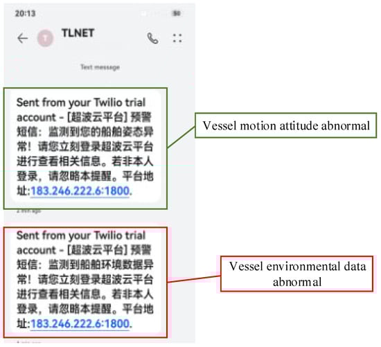 Except for the above warning for the vessel attitude motion’s danger status, if the temperature and humidity exceed the threshold value, the decision support system also sends an SMS warning notification to the smartphones of crew members (as shown by the red rectangle in Figure 14), and a warning notification pops up on the web application platform (as shown by the red rectangle in Figure 15). In addition, the GPS module provides real-time location data, enabling vessel managers to monitor the vessel’s position in real time. This helps in ensuring the vessel stays on the planned route and facilitates search-and-rescue operations if needed. The surveillance camera monitors the cockpit and deck areas. It can detect if the cockpit is unattended or if there are personnel near the deck edges, and alert the vessel managers in such situations, enhancing crew safety. These components collectively contribute to a more robust and multifaceted safety monitoring system.