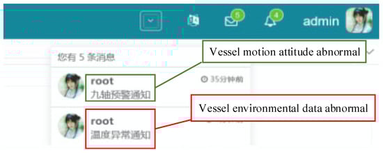 It can be concluded that if the “danger score” calculated in the previous section is above 1, the decision support system sends an SMS warning notification to the smartphones of crew members (as shown in Figure 14 green rectangular), and a warning notification pops up on the web application platform (as shown by the green rectangle in Figure 15).