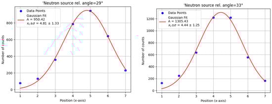 Gaussian fits of the 4.44 MeV gamma-ray peak counts as a function of x axis target position for two different relative neutron source angles. The optimal angle of yields the highest peak amplitude, indicating optimal alignment between the tagged neutron beam and the x axis position.