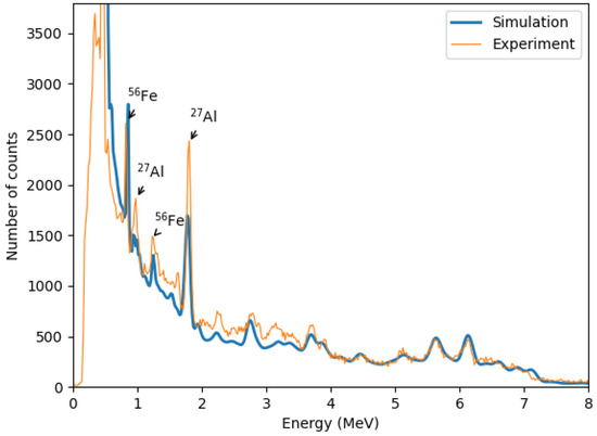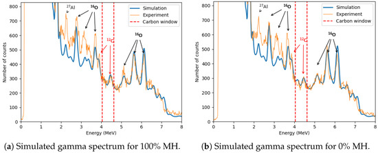 The zoomed-in spectra presented in Figure 15 demonstrate that the carbon peak at 4.44 MeV in the MC simulations closely aligns with the experimentally observed peak. Additionally, a notable difference is observed in the background within the energy range (≈2–3.83 MeV), where the experimental data exhibit significantly higher counts compared to the simulation results. This discrepancy likely arises from the fact that the simulations include only the essential components of the experimental setup, whereas the physical experiment also involves additional elements, such as structural components and surrounding laboratory materials, which contain oxygen. The presence of these materials in the experimental environment contributes to an increased background signal, particularly in the oxygen-dominated energy region.