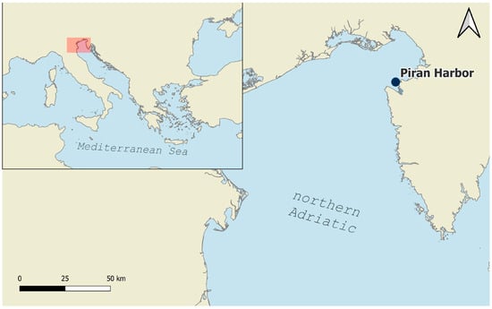 Piran Harbor, the place where the experimental colonies were collected, is located in the Gulf of Trieste, a shallow gulf at the northernmost end of the Adriatic Sea (Figure 2). The northern Adriatic Sea is known for pronounced tidal fluctuations [37] and low temperatures in winter, which average around 10 °C [38]. Although the salinity in the gulf is generally marine, it is significantly influenced by substantial freshwater inputs, particularly from the Soča river. This river supplies large quantities of detrital material originating from the hinterland. The area is also characterized by the resuspension of bottom sediments, increasing pollution and other anthropogenic pressures [39,40].