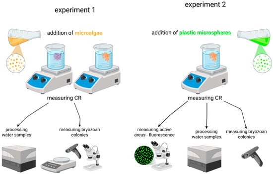 We conducted two experiments. The first aimed to assess the clearance rate (CR) of two bryozoan species, S. errata and B. neritina, and to determine the most appropriate units for quantifying their biofiltration capacity. In this experiment, the colonies were fed the microalga Dunaliella sp. (average size: 9 μm × 4 μm). The second experiment focused exclusively on S. errata colonies and aimed to identify active feeding areas within the colonies while quantifying their feeding activity using 10 μm fluorescent polystyrene microspheres (Fluoresbrite® YG, Polysciences, Harrisburg, PA, USA; density 1.05 g/cm3). Analysis showed the surface properties (surface tension and wettability in saltwater) of these plastic particles were comparable to those of microalgae (Tetraselmis, Nitzschia) [43]. The experimental setup is shown in Figure 3.