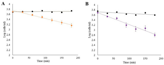 A comparison of the decrease in cells of the Dunalliela sp. when two species, (A) Schizoporella errata and (B) Bugula neritina were feeding on them. The black lines represent controls, the orange line the S. errata treatment and the purple the B. neritina treatment.