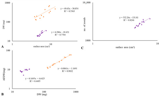 Colony fragment measurements of S. errata (orange) and B. neritina (purple): (A) the correlation between the surface area and the dry weight of the colonies, (B) the correlation between the dry weight and the ash free dry weight of the colonies, (C) the correlation between the surface area and the number of zooids in colonies.