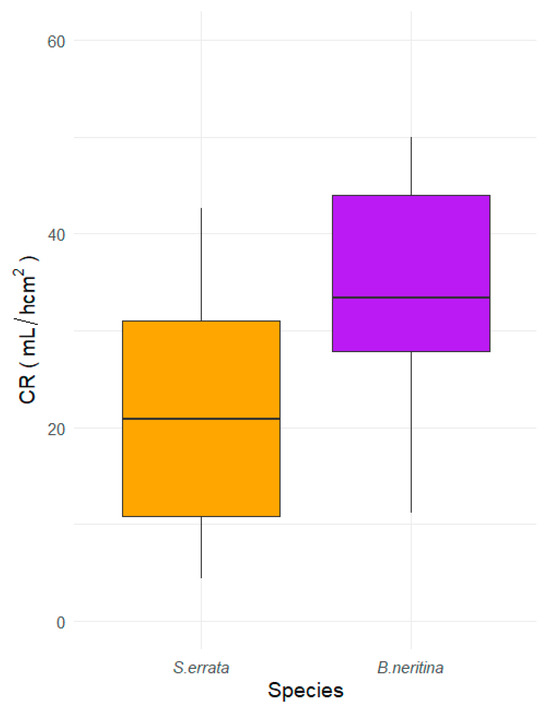 Due to the differences in weight and morphology between the species, the surface area is the most useful unit for comparing the CR. The average CR per unit area was 20.08 mL/(h·cm2) for S. errata and 33.14 mL/(h·cm2) for B. neritina (Figure 6). These differences were statistically significant (t-test; −2.5037, df = 24, p = 0.019).