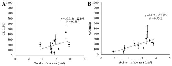 Relationship between CR (average in black bullets ± SE in error bars) and estimated total surface area (A) and active surface area (B) of S. errata colonies fed with plastic beads.