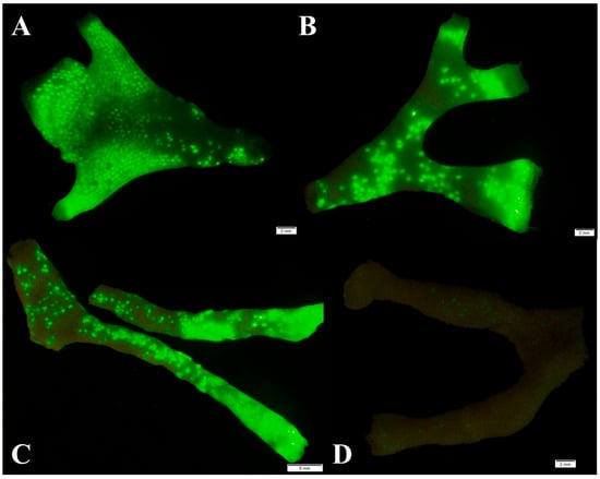 Colony fragments of S. errata which were fed with fluorescent microspheres, where fluorescence of the beads in the polypides is clearly visible (A–C) and a colony fragment where the colony did not feed (D).