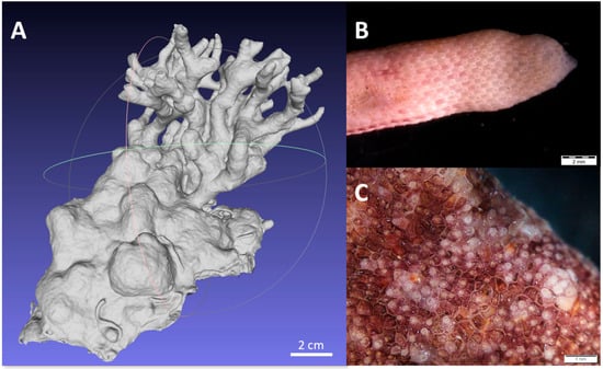 S. errata is a fast-growing encrusting to erect bryozoan species, with the average lateral growth rate in favorable conditions of 0.73 cm2/day [26]. Autozooids have irregular shapes and highly variable dimensions, oriented differently in multilaminar colonies. Zooids are without spines, and avicularia are rare [27]. Due to its plastic budding abilities [28], this species can form large and heterogeneous colonies with tubular antler shaped to lobe-forming erect calcified structures [29]. Such colonies reach 40 cm in size [24], and the reef-like structures can be up to 1 m long [30] (Figure 1A). The species can be found in pleiomesohaline, euhaline and polyhaline waters of warm temperate to tropical regions [31] and does therefore exhibit a high tolerance to temperature and salinity. Due to the aforementioned characteristics, S. errata also has a high invasive potential [27].