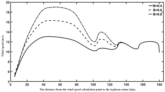 The radial pressure distribution parameter B in the Holland model critically modulates the typhoon intensity metrics and wind field structure. Under controlled conditions with a fixed central pressure () and radius of maximum winds (Rmax), sensitivity analyses revealed that elevated B values produced progressively steeper wind speed profiles (Figure 1). This steepening gradient manifests as intensified barotropic pressure differentials between the typhoon core and transitional zone, particularly enhancing the wind speed variability of the storm center in blended wind field simulations.
