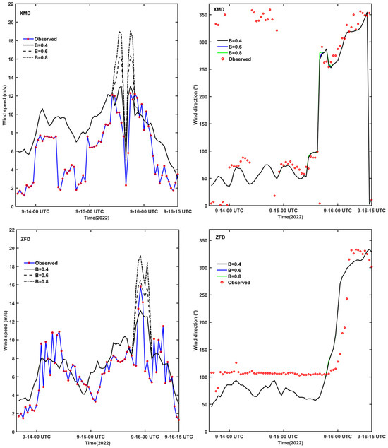 Comparisons between hybrid wind field simulations and in situ anemometer measurements at Xiaomai Island (XMD) and Zhifu Island (ZFD) demonstrated different capabilities in capturing dynamic wind speed/direction variations under varying parameter B configurations (Figure 2). Calibration at B = 0.4 achieved optimal alignment with observed wind speeds (RMSE < 4.0 m/s) while maintaining directional consistency (mean angular deviation < 35°). However, early-phase typhoon simulations exhibited systematic overestimation, particularly at the XMD station, where the blended wind speeds exceeded the measurements. This discrepancy stems from inherent limitations in the capacity of the Holland model to replicate the asymmetric wind structure characteristics of real-world typhoons, which often generate intensified peripheral flows [12].