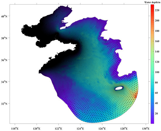 The Typhoon Storm Surge Model (TSSM) and Extratropical Storm Surge Model (ESSM) were constructed using the Surface Water Model System (SMS) with the Global Self-Consistent, Hierarchical, High-Resolution Geography (GSHHG) dataset to generate horizontally unstructured triangular grids (Figure 3). The computational domain spans 117–129° E and 30–41° N, employing σ-coordinates vertically with nine layers. Open boundaries were positioned 750 km beyond the study area to adequately resolve the surge generation and propagation dynamics. Bathymetric inputs adopted the General Bathymetric Chart of the Oceans (GEBCO_2023) “https://www.gebco.net (accessed on 15 March 2025)” 15-arcsecond grid (IHO/IOC standard) and high-resolution electronic navigational charts (ENCs) for nearshore zones (<80 m depth), all of which referenced the mean sea level. The bottom friction was parameterized using a quadratic drag coefficient (Cd = 0.0012). Table 1 summarizes the critical TSSM/ESSM configuration parameters, including mesh resolution, time step, and run duration.