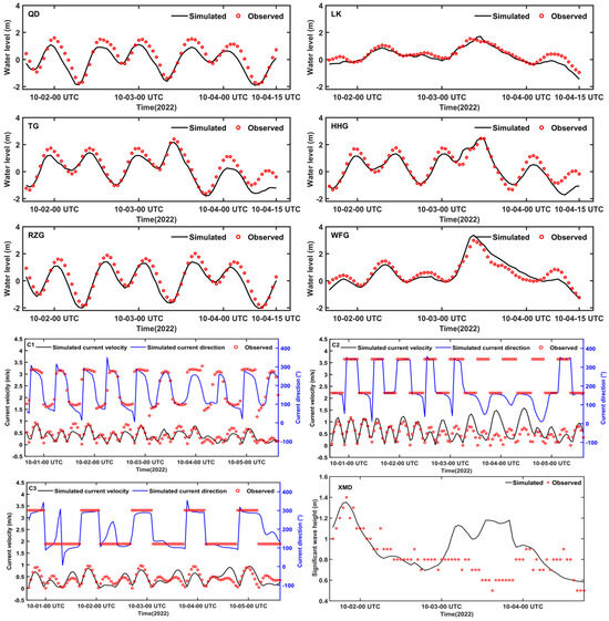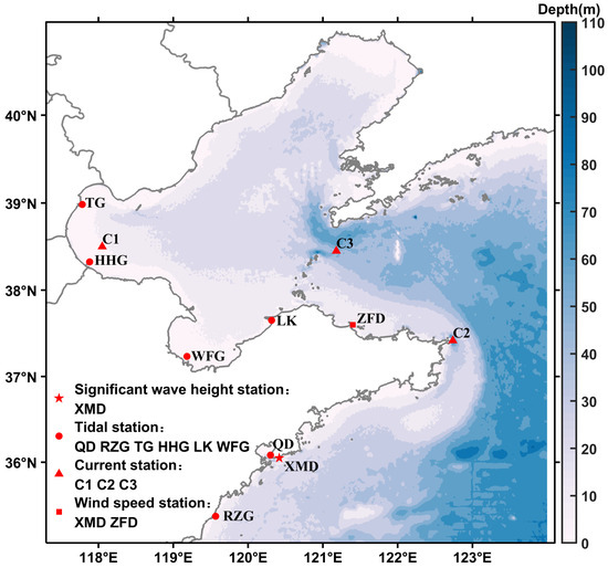 The tide level validation data are from the measured water level data of six tide gauge stations: Qingdao (QD), Longkou (LK), Tanggu (TG), Huanghua harbor (HHG), Rizhao harbor (RZG), and Weifang harbor (WFG). The validation data of tidal current, effective wave height, and wind speed were obtained from the National Ocean Science Data Center “https://mds.nmdis.org.cn (accessed on 15 March 2025)”, a national platform for sharing scientific and technological resources, of which the current flow data were the tidal current prediction results of the three stations, namely, Bohai Sea Route (C1), Chengshanjiao (C2), and Laotieshan Waterway (C3). The significant wave height data were the measured data from Xiaomai Island (XMD), and the wind speed measurement stations were the two stations from Xiaomai Island (XMD) and Zhifudao Island (ZFD). The locations of these stations are shown in Figure 4.