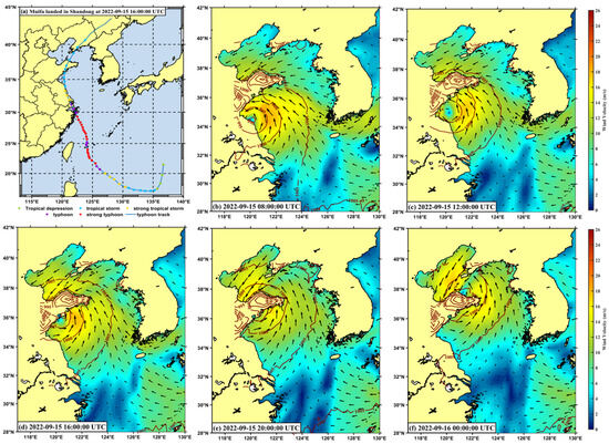 Typhoon Muifa’s track was obtained from the China Meteorological Administration’s (CMA) Tropical Cyclone Best Track Dataset [20,21], with the genesis occurring at 21.5° N, 136.7° E [22] in the western North Pacific (Figure 5a). The system made landfall as a tropical storm (TS) at Laoshan, Qingdao (36.15° N, 120.65° E), on 16 September 2022, at 0000 UTC (0800 Beijing Time), featuring a central pressure of 990 hPa and a maximum sustained wind speed of 23 m/s (Beaufort Force 9). During its Shandong coastal transit (15 September 0800-1600 UTC), the storm induced a steepened pressure gradient, generating 8–10 Beaufort scale gusts (17–24 m/s) and localized precipitation exceeding 150 mm. The system continuously propagated northeastward, with cyclonic energy concentrated over the Bohai Sea (37.0–41.0° N, 118.7–122.3° E). By 0400 UTC on 16 September, it had again made landfall in Liaoning (39.6° N, 122.5° E) and was gradually weakening (Figure 5b–f). Wind vectors (10 m elevation, black arrows) and isobars (red contours) illustrate evolving synoptic patterns.