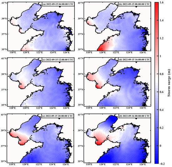 Spatial distribution of storm surge calculated by TSSM. (a–f) show the storm surge at four-hour intervals from 15 September 2022, 0400 UTC to 16 September 2022, 0000 UTC. ‘Storm surge’ is the total water gain from the modeled total water levels minus the modeled astronomical tide levels.