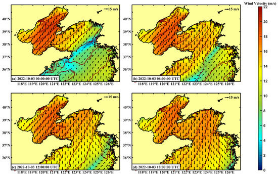 From 2 to 4 October, a southward-propagating cold air mass originating from Siberia and Mongolia triggered a nationwide cold wave event, inducing temperature descent ranges exceeding 12 °C with 9–11 Beaufort scale northeast gales across the Bohai-Yellow Sea coastal zone [22,23]. This synoptic pattern generated severe extratropical storm surges along Bohai Bay, Laizhou Bay, and the northern coast of Shandong. Between 0000 and 1800 UTC on 3 October, the eastward-migrating East Asian trough transitioned from zonal to meridional orientation, driving sustained coastal pressure rises in Shandong accompanied by persistent 7–9 Beaufort northeast winds (gusting 9–11 Beaufort) (Figure 10).