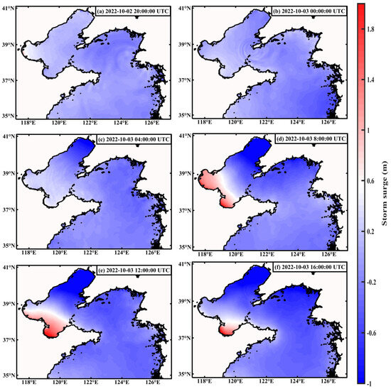 Spatial distribution of storm surge calculated by ESSM (interval of 4 h). (a–f) show the storm surge at four-hour intervals from 2 October 2022, 2000 UTC to 3 October 2022, 1600 UTC. ‘Storm surge’ is the total water gain from the modeled total water levels minus the modeled astronomical tide levels.