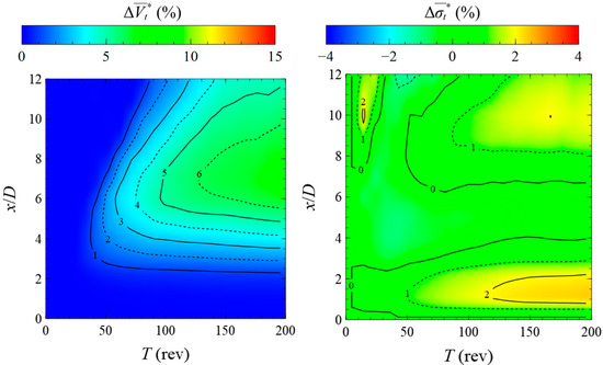 From the above explanation, the wind turbine wake evolves over time and space. Figure 12a visualizes the contour of the difference in the normalized time-averaged velocity between surging and stationary turbines. In the near-wake region within 5 behind the turbine, it is clear that the influence of surging behaviors on the normalized time-averaged velocity is always less than 1% of within 2 behind the turbine. The influence is less than 1% of in the whole downstream region when the solution time is less than 40. The influence increases from less than 1% to 5% as the solution time increases from 40 to 120, indicating that it takes at least 120 rotor revolutions for the influence to converge in the near-wake region. After 120 rotor revolutions, the influence becomes more evident, increasing from less than 1% to 5% of along 2 to 5 behind the turbine. In the far-wake region, which is after 5 behind the turbine, the influence increases from less than 1% to 6% after 40 rotor revolutions. The largest propagation distance of the surging behavior extends from 5 to 12 with a linear trend of 0.128 farther per revolution. Figure 12b shows the contour of the difference in the normalized time-averaged velocity between pitching and stationary turbines. In the near-wake region, which is within 5 behind the turbine, the influence of pitching behaviors on the normalized time-averaged velocity is less than 1% of when the simulation time is less than 10. The influence increases from less than 1% to 12% as the simulation time increases from 10 to 140. This indicates that it takes at least 160 rotor revolutions for the influence to converge in the near-wake region. After 160 rotor revolutions, the influence becomes stable and increases from less than 2% to 12% of along 2 to 5 behind the turbine. In the far-wake region, which is beyond 5 behind the turbine, the influence increases from less than 1% to 12% after 10 rotor revolutions. The largest propagation distance of the pitching behavior increases from 5 to 12 with a linear trend of 0.25 farther per revolution. The difference in the normalized time-averaged velocity appears before 10 rotor revolutions at the mid-wake regions within 6 to 8, as well as from 10 to 12 behind the turbine, and the error caused by the stationary rotor during the 200 rotor revolutions is negligible.