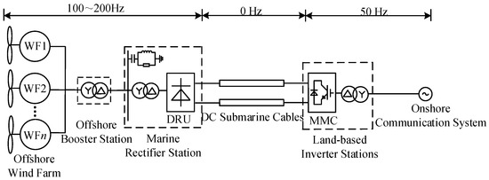 Currently, phase-commutated converter (LCC-HVDC) and voltage-source converter (VSC-HVDC) are the mainstream technologies. The LCC-HVDC system has a large transmission capacity and high reliability, but its converter valves are unable to be actively switched off, and its stability is poor [4]. The VSC-HVDC system, on the other hand, adopts omni-controllable device IGBTs, which are flexible to be controlled, but its application is limited in high-voltage and large-capacity occasions [5,6]. In order to overcome this problem, modular multilevel converter (MMC) technology has been proposed. With high modularity, low switching frequency and good voltage waveform, MMC has become a standard scheme for flexible DC transmission and has been applied in real offshore wind power projects [7]. In a typical scheme, the remote offshore wind turbine adopts a grid-following type of control, which makes the operating frequency of the wind farm consistent with that of the onshore grid. Modular multilevel converters (MMCs) are used at both ends of the DC transmission system, where the MMC at the sending end is controlled by voltage magnitude-frequency (V-f) and the MMC at the receiving end is controlled by constant DC voltage. It is estimated that the offshore platform is large under the typical scheme, and its investment accounts for 19% of the investment in the entire offshore wind power DC transmission project [8].